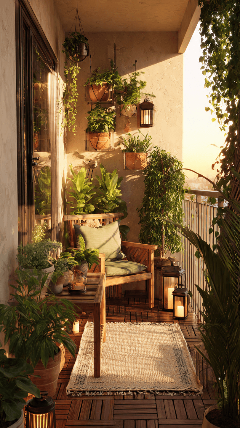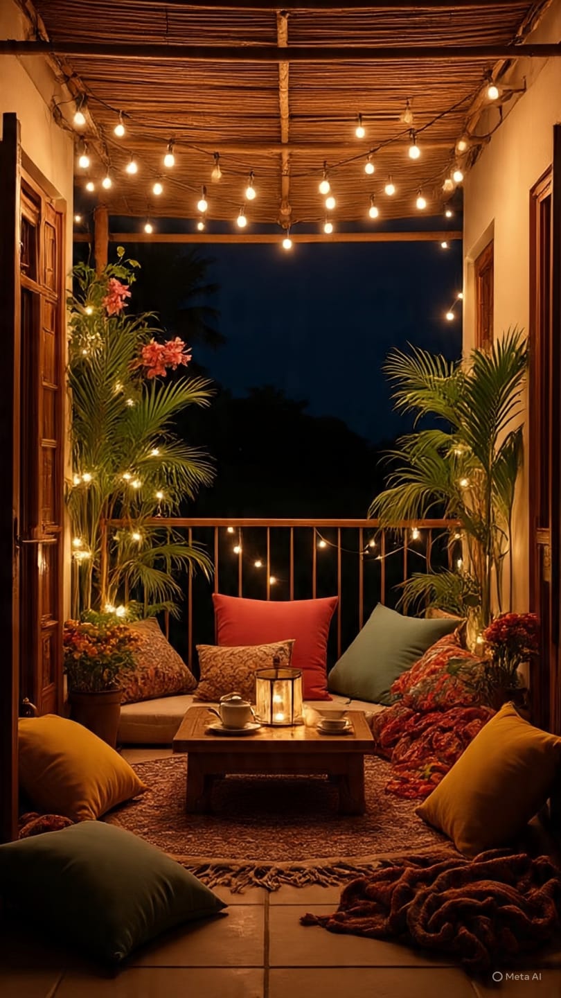 Set the mood with soft lighting – fairy lights or lanterns make your balcony magical at night.